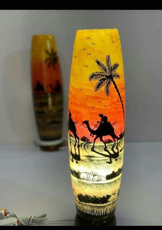 Immerse yourself in the beauty of Pakistani craftsmanship with this one-of-a-kind hand-painted camel skin lamp. Crafted from pure camel skin leather and meticulously hand-painted, this unique lamp boasts a width of 15 centimeters, a height of 50 centimeters, and a depth of 15 centimeters.