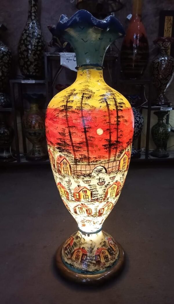 Light up your home with the captivating beauty of Pakistan. This handcrafted 24-inch camel skin vase lamp boasts traditional artistry and provides a warm, ambient glow. Shop now and add a touch of cultural heritage to your décor!