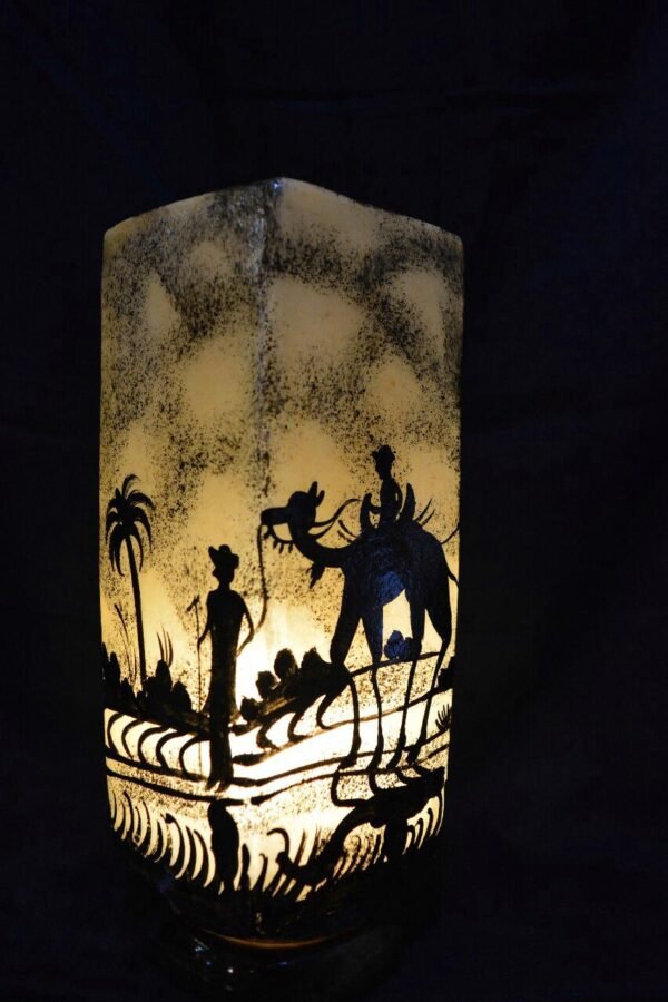 Elevate your space with the captivating beauty of a one-of-a-kind Camel Skin Box Lamp. Each 13-inch box lamp is handcrafted from ethically sourced camel skin and adorned with stunning hand-painted motifs. But the real magic unfolds when you turn on the light. The warm glow illuminates the artwork, transforming the lamp into a mesmerizing centerpiece.