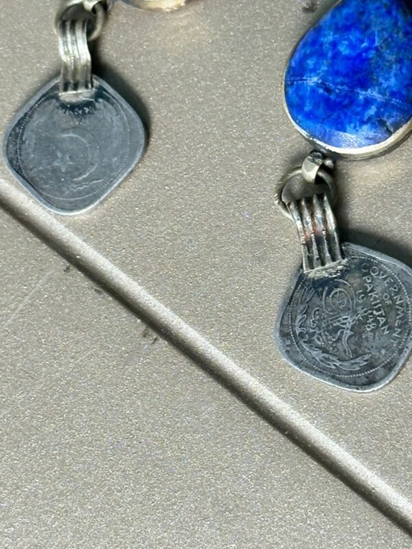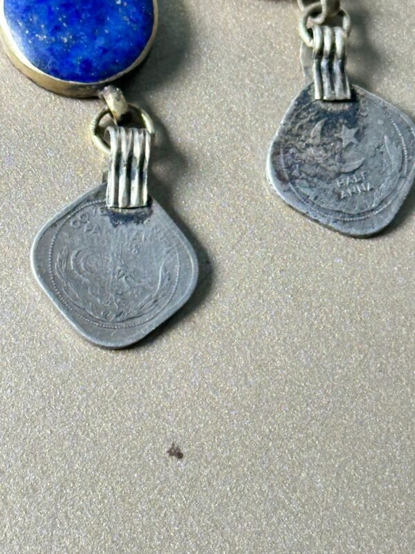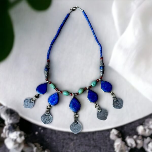 This beautiful and bold handmade semi-precious lapis lazuli necklace with five dangling tassels beautified with brown beads. Each pendant is inlaid with teardrop and round gorgeous lapis lazuli stone that have such a deep blue color which makes this elegant statement piece.